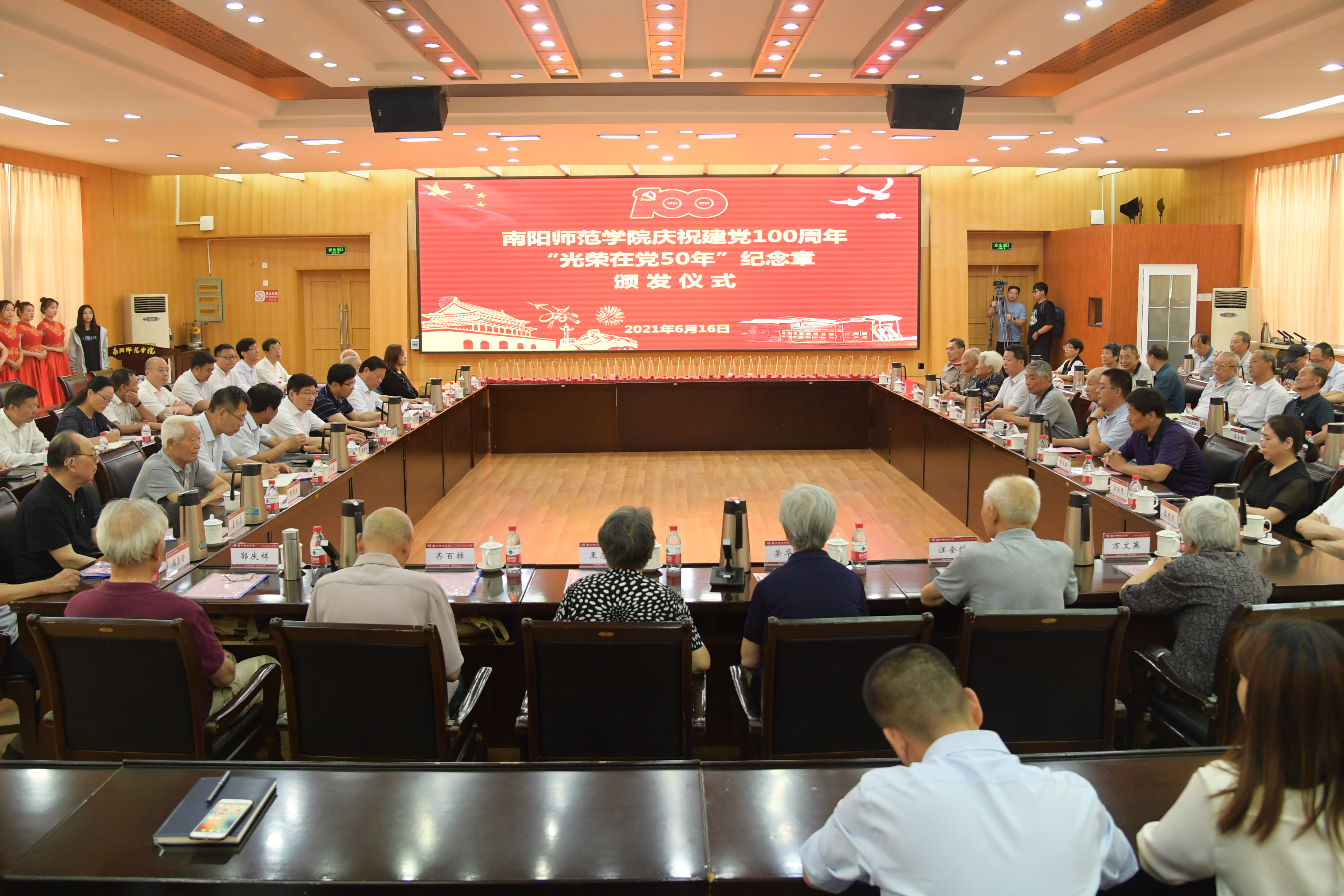 1.颁发仪式现场.jpg 2.校党委书记卢志文带领全体党员宣誓.jpg 3.校党委书记卢志文为39名老党员或亲属颁发“光荣在党50年”纪念章和纪念杯.jpg 4.校党委书记卢志文为39名老党员或亲...
