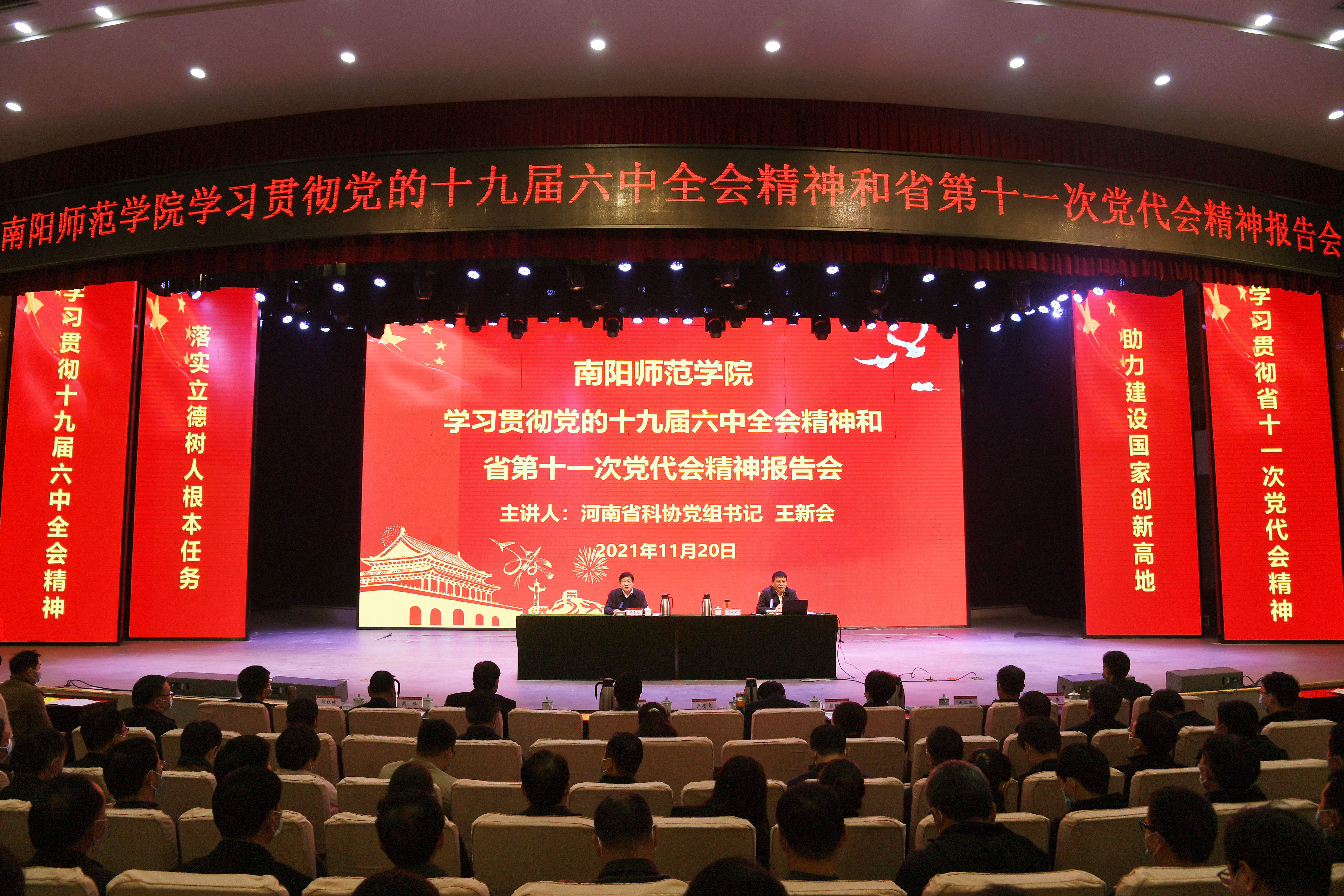1.报告会现场2.河南省科协党组书记王新会作专题报告3.校党委书记卢志文主持报告会4.报告会现场本网讯(通讯员 刘一夫/文 刘奥男 王占元/图)11月20日上午,新葡的京官网举行学习宣传贯彻党的十九届六中全会精神和省第十一次党代会精神专题报告会。省科协党组书记王新会作辅导报告。全体校领导、全体中层干部和学工队伍人员,南阳市科协党组书记刘伟和市科协全体中层干部参加。校党委书记卢志文主持报告会。王新会以《深入学习贯彻中央全...