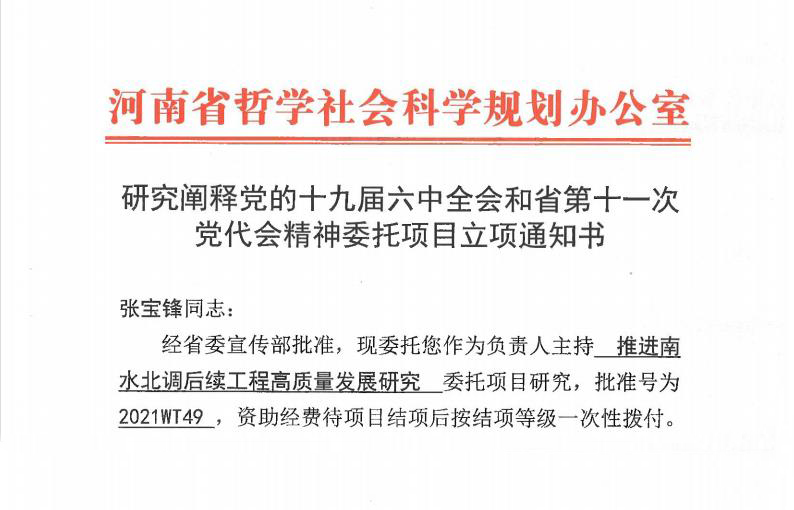 本网讯(通讯员 宋丽丽 张恒杰)近日,河南省哲学社会科学规划办公室下发“研究阐释党的十九届六中全会和省第十一次党代会精神”委托项目立项通知书。经省委宣传部批准,委托新葡的京官网校长张宝锋教授作为负责人承担“推进南水北调后续工程高质量发展研究”课题(项目批准号:2021WT49)的研究工作。据悉,省社科规划办设立委托项目,目的是为了全面准确宣传阐释党的十九届六中全会和省第十一次党代会精神,确保党中央和省委的决策部...