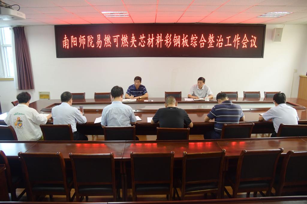 本网讯(通讯员 王大春/文 宋清华/图)为全面落实河南省人民政府办公厅关于印发《全省高层建筑消防安全专项整治工作方案》的通知和省教育厅办公室关于印发《全省教育系统易燃可燃夹芯材料彩钢板综合整治工作方案》的通知,9月16日下午,副校长朱其春、熊新忠组织召开了校园安全综合整治工作会议,校长办公室、保卫处、后勤管理与服务中心、基建处、国有资产与设备管理处等单位负责同志参加会议。