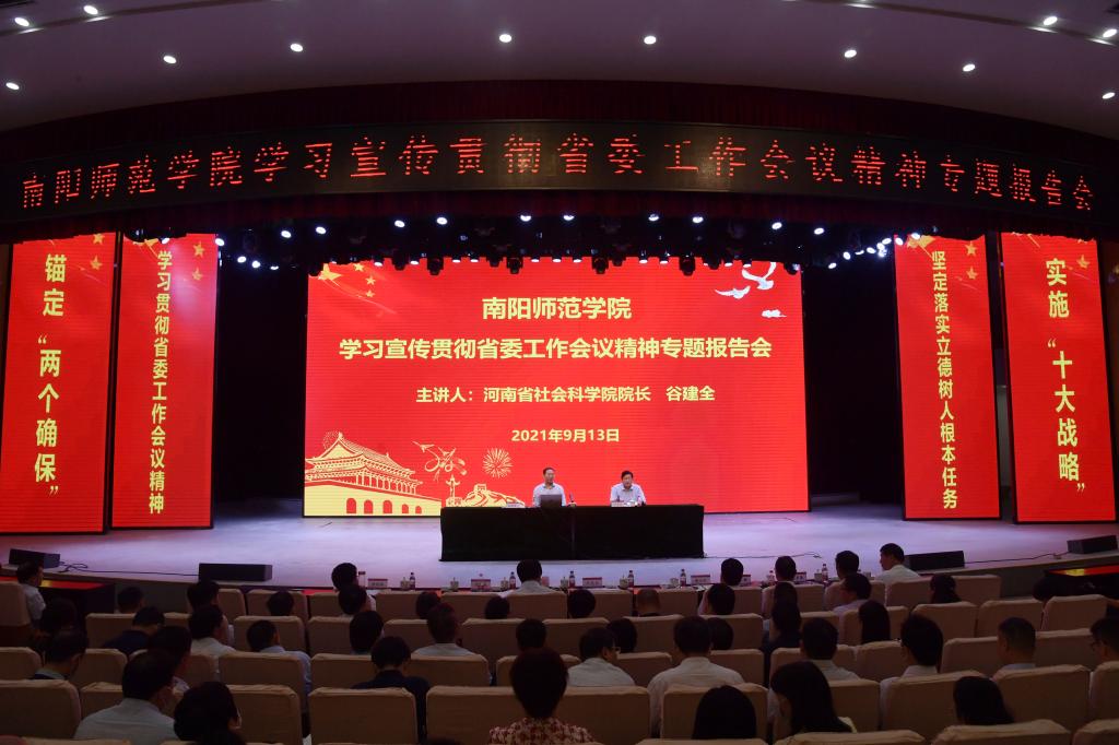 本网讯(通讯员 刘一夫/文 宋清华/图)9月13日下午,350vip8888新葡的京集团在中区音乐厅举行学习宣传贯彻省委工作会议精神专题报告会。河南省社科院院长谷建全应邀作专题报告。校党委书记卢志文主持报告会。全体校领导、全体中层干部、全体学工队伍人员和学生干部代表参加报告会。