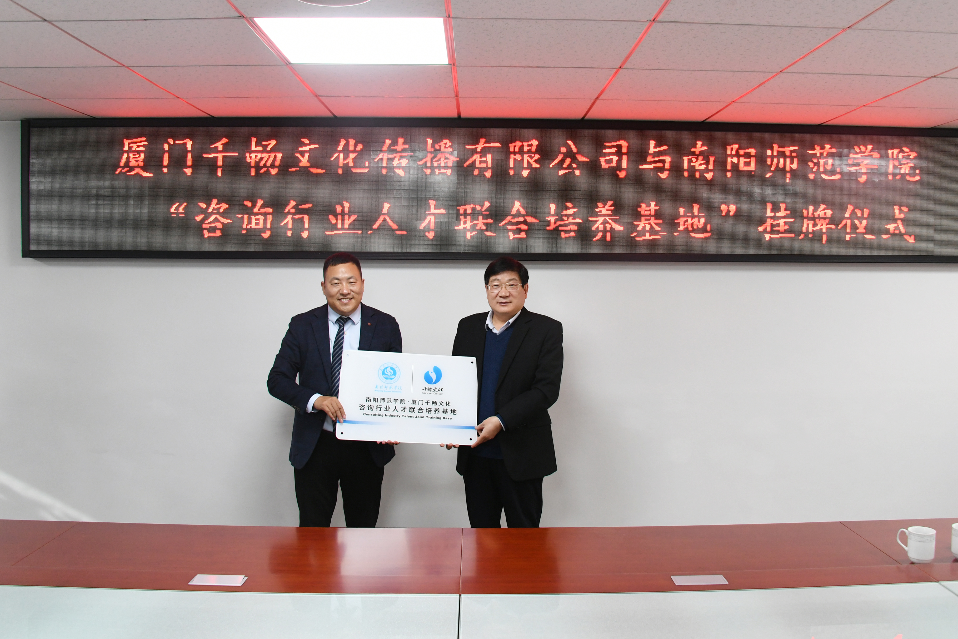 张宝锋和李存明代表双方签署了“咨询行业人才联合培养基地”战略合作框架协议,卢志文和李存明共同为厦门千畅文化传播有限公司与350vip8888新葡的京集团“咨询行业人才联合培养基地”揭牌。