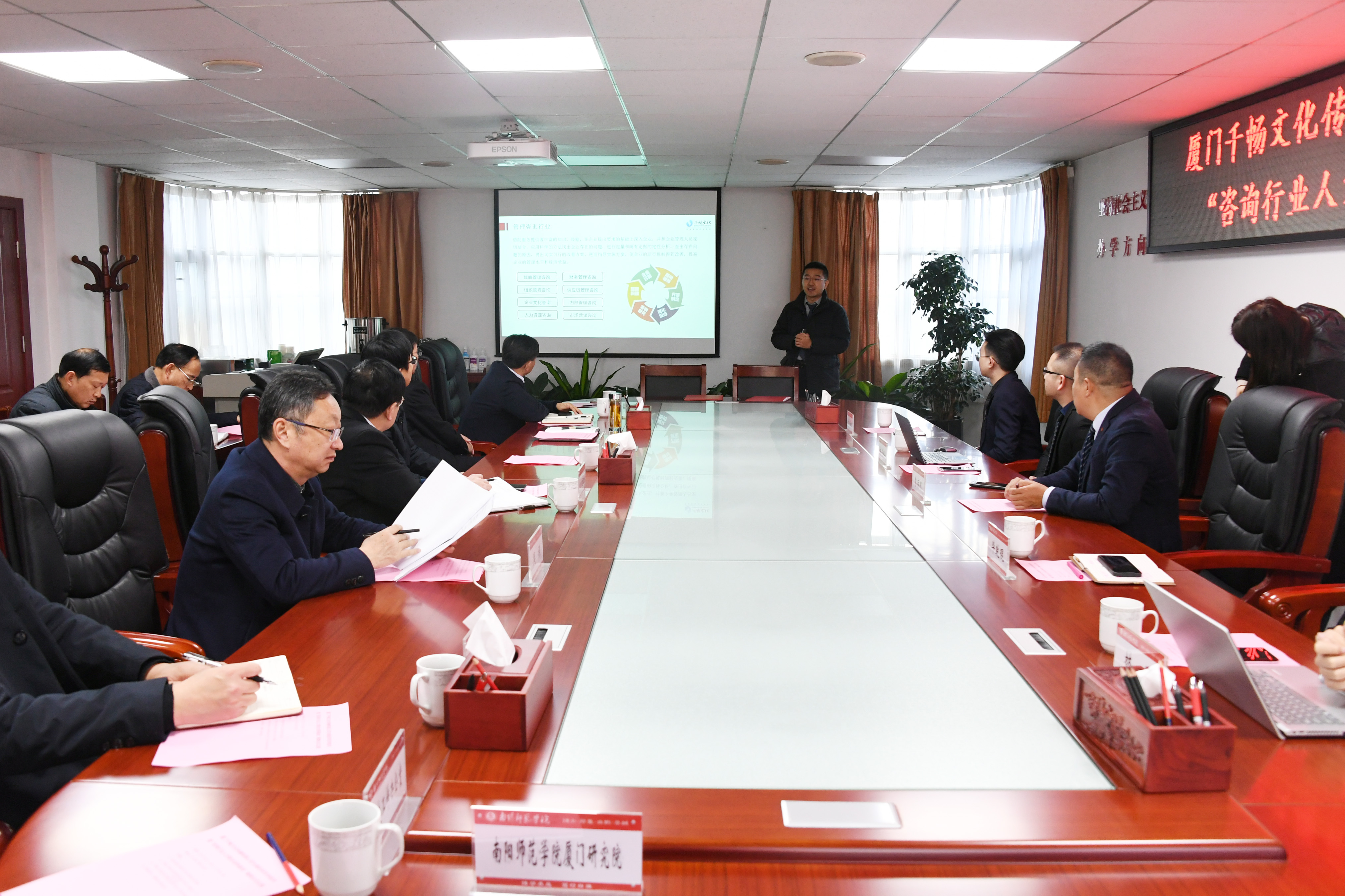 会上,张宝锋代表学校对厦门千畅文化传播有限公司李存明董事长一行来校参加“咨询行业人才联合培养基地”揭牌仪式表示热烈欢迎。他全面介绍了学校发展情况,希望双方以此次“咨询行业人才联合培养基地”成立为契机,深入开展合作。林兆裕、毕乾琨分别介绍了厦门千畅文化传播有限公司的情况及厦门千畅文化传播有限公司与350vip8888新葡的京集团“咨询行业人才联合培养基地”筹建情况。随后,李存明表达了对350vip8888新葡的京集团的感恩以及对350vip8888新葡的京集团厦门研究院开放办学的支持,并对“咨询行业人才联合培养基地”的建设前景进行展望。