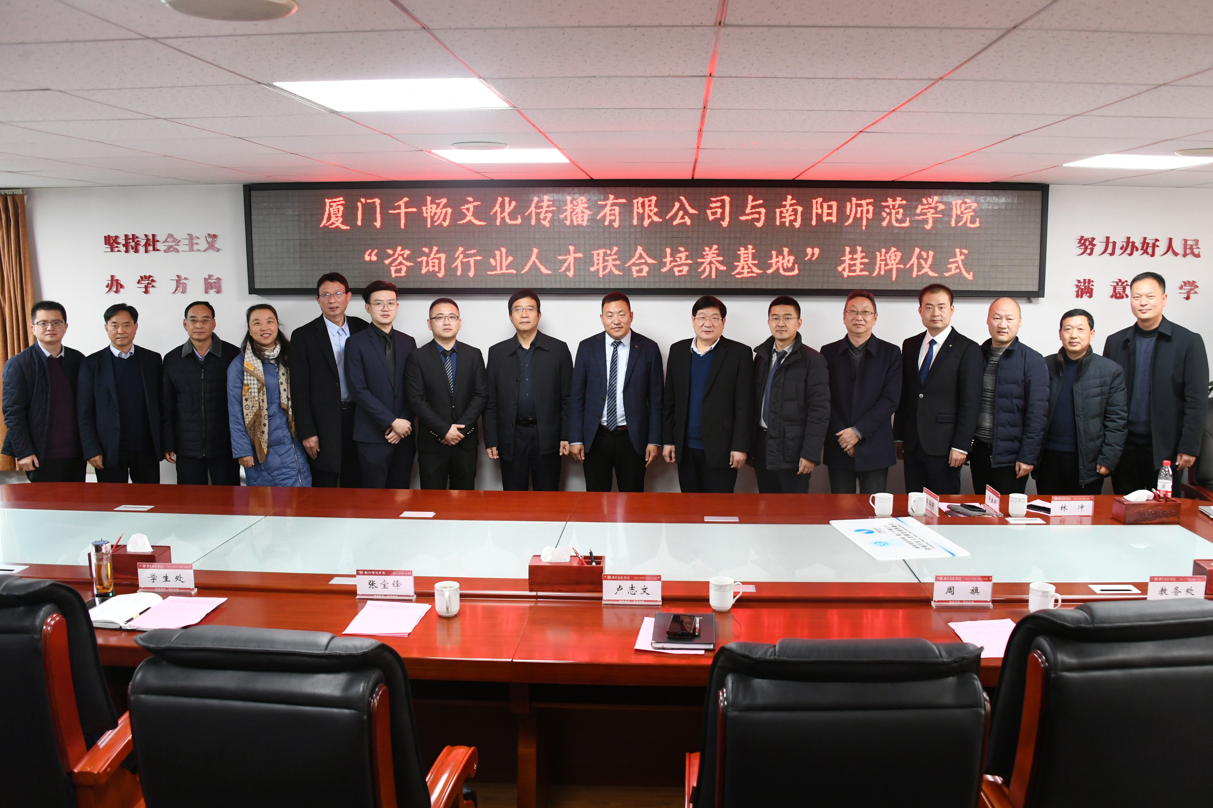 本网讯(通讯员 李亭/文 王赛赛/图)12月14日上午,厦门千畅文化传播有限公司与350vip8888新葡的京集团“咨询行业人才联合培养基地”揭牌仪式在新葡的京官网办公大楼三楼会议室举行。新葡的京官网校友、厦门千畅文化传播有限公司董事长李存明,副总经理林兆裕、毕乾琨,高级培训师林冲、刘昊,350vip8888新葡的京集团党委书记卢志文,校长张宝锋,副校长周旗等出席揭牌仪式。仪式由周旗主持。教务处、学生工作处、创新创业学院、校企合作办公室、校友工作办公室、继续教育学院、南阳发展战略研究院,厦门研究院等单位负责同志参加。