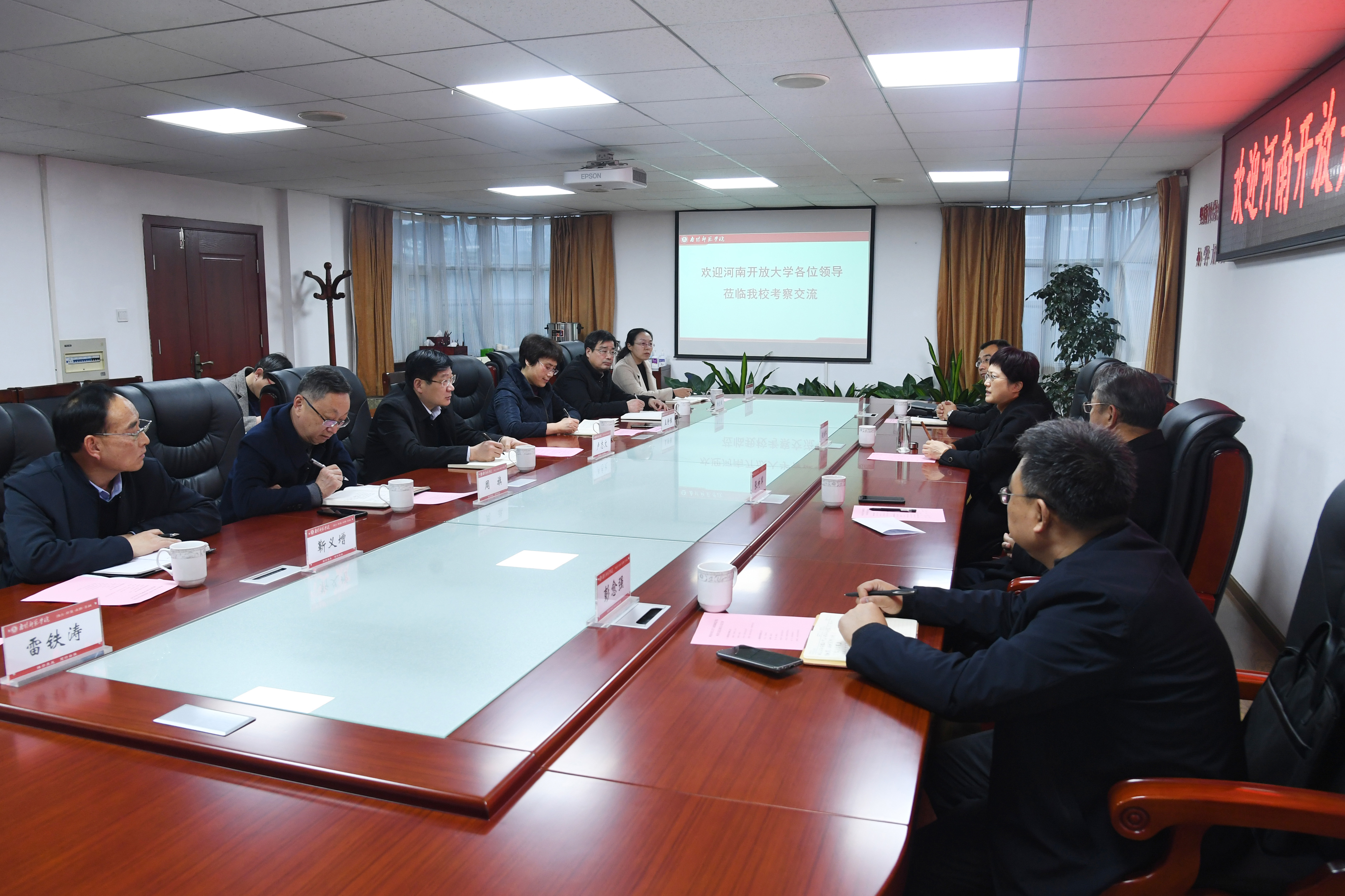 本网讯(通讯员 周耀民/文 刘奥男/图)12月15日下午,河南开放大学党委书记、校长赵继红,副校长张树军,党政办主任宋大林,招生办主任、系统建设处处长彭愈强一行莅临新葡的京官网考察交流。校党委书记卢志文,校长张宝锋,副校长孟静雅、周旗陪同。党委办公室、教务处、继续教育学院、创新创业学院负责同志参加座谈交流。副校长孟静雅主持座谈会。