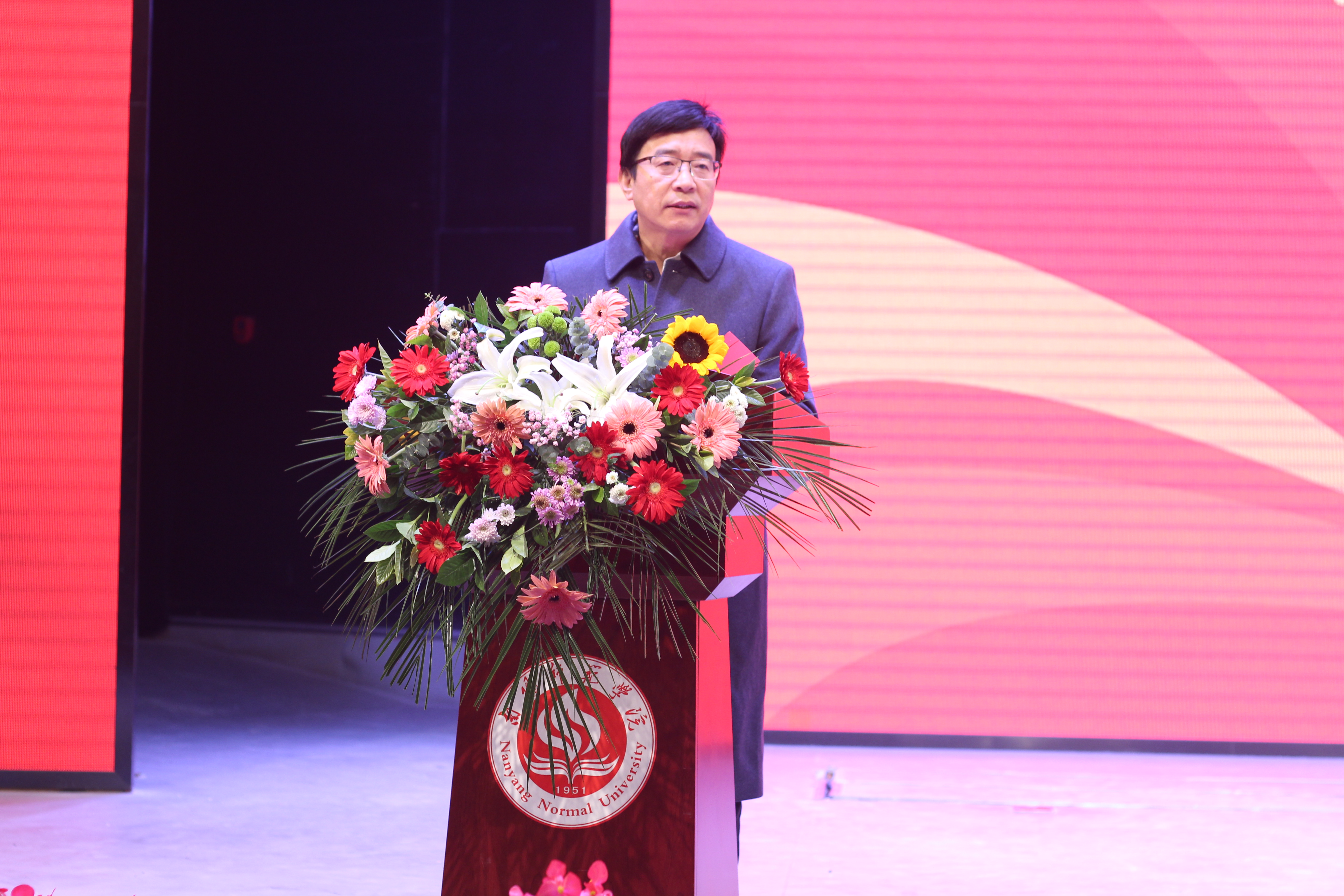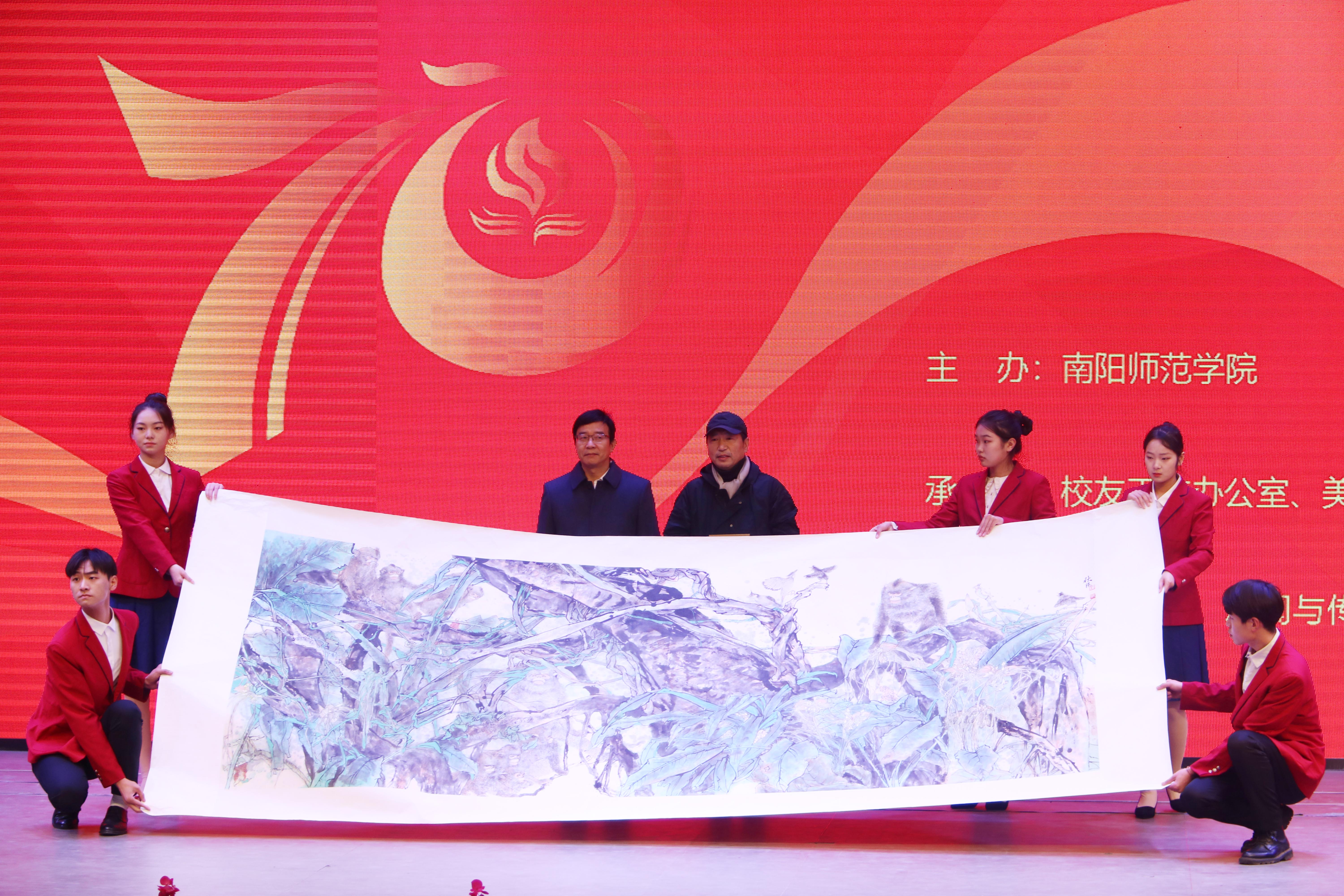 校长张宝锋致辞。他代表学校全体师生,对长期关注和支持学校的社会各界人士表示诚挚的感谢。他对刘秋阳、房巍、乔云三位校友在建校70周年之际返回母校举办画展和学术活动给予赞誉。他介绍了学校70年发展历程,总结了学校在办学实力、人才培养、服务社会、文化传承等方面取得的成就。张宝峰说,70年来,350vip8888新葡的京集团始终秉持“博学求是,笃行自强”的校训,坚守“博大、厚重、睿智、卓越”的大学精神,在党的坚强领导下,团结带领全校师生,深入贯彻落实党的教育方针,不断增强“四个意识”,坚定“四个自信”,做到“两个维护”,拥护“两个确立”,坚守“为党育人 为国育才”初心使命,与国家、民族的发展同向同行、同频共振,不断为地方经济社会发展贡献智慧和力量,书写了一曲开拓奋进的时代华章。他说,凡过往,皆序章,站在第二个百年的历史时刻,全体南阳师院人将以时不我待、我将无我的精神状态,朝着加快建设“特色鲜明的应用型高水平大学”目标奋勇前进。