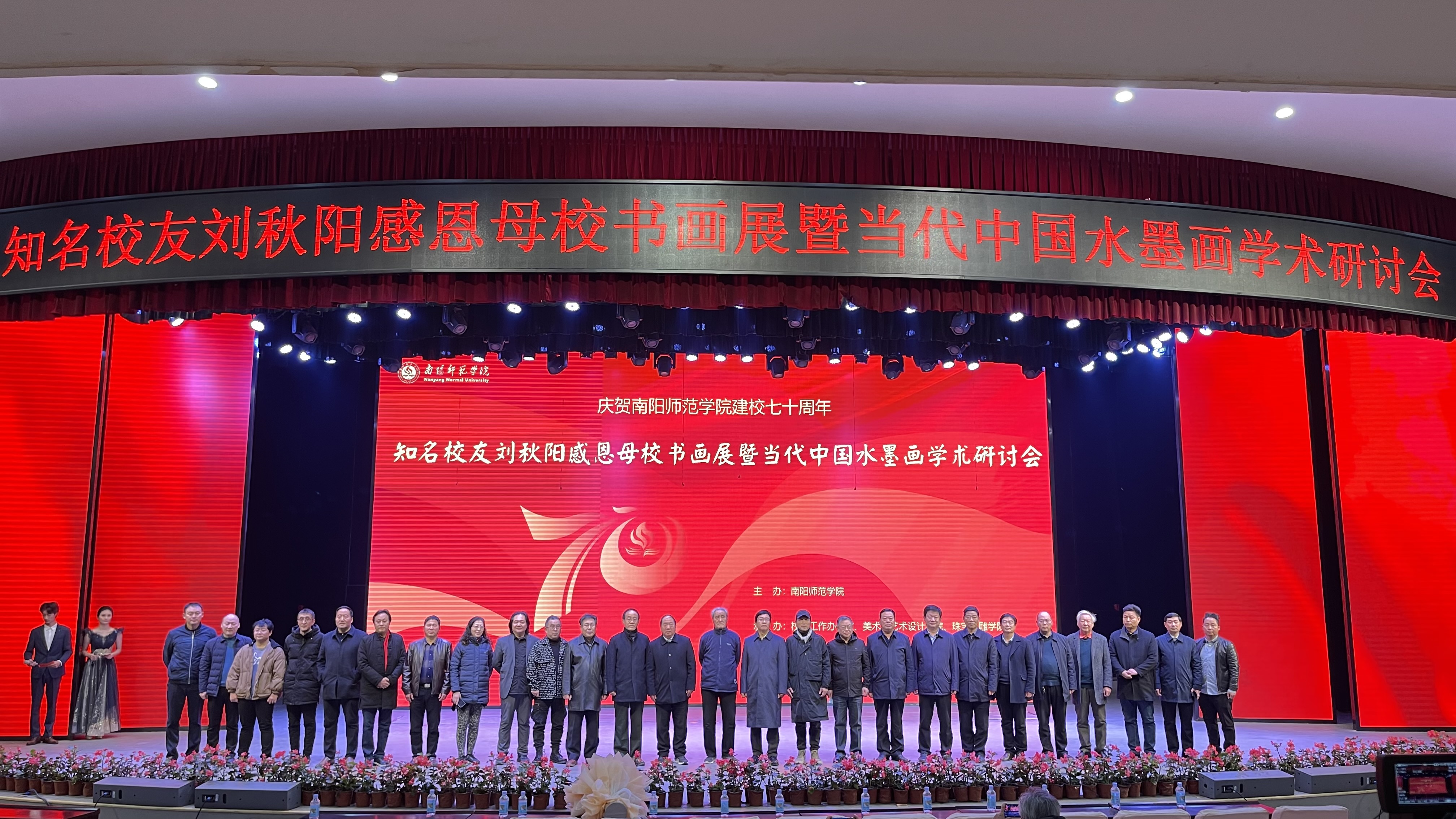 本网讯(通讯员 梅超 李晨/文 吴杨/图)12月23日上午,“350vip8888新葡的京集团建校70周年——知名校友刘秋阳感恩母校书画展暨当代中国水墨画学术研讨会”在中区音乐厅开幕。原国家广播电影电视总局机关服务局副局长万顺府,国家一级美术师马德利,雄安画院院长李洪涛,北京一得阁特邀顾问刘德生,南阳市文联、市文化广电旅游局、市美协、市书协等十余家单位负责同志和专业人士莅临。中国美术家协会会员、知名校友房巍、乔云、刘秋阳返校。校长张宝锋,校党委副书记、工会主席邵书峰,校党委副书记谢冰松,副校长孟静雅,纪委书记、监察专员于继武,副校长朱其春,副校长刘红林出席。学校相关单位负责同志及师生代表参加。