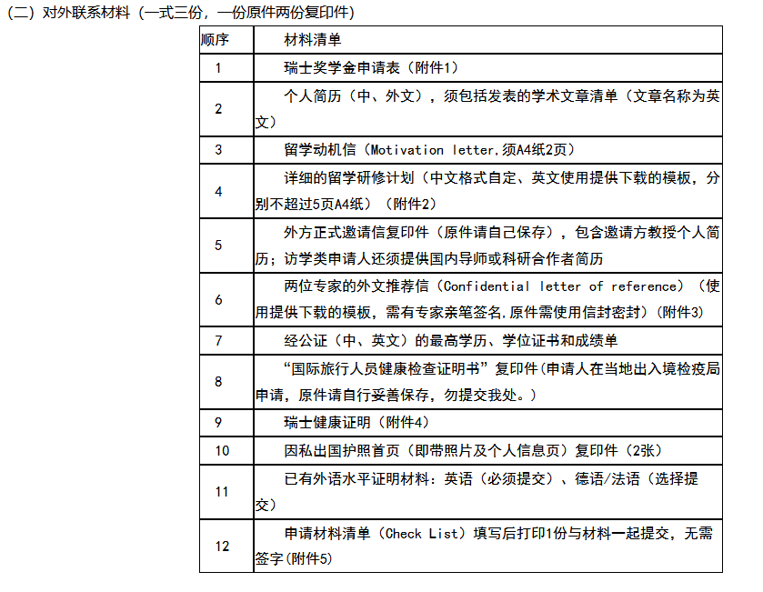 4. 网上报名:10月14日至10月28日,经公示无异议的申请人登录国家公派留学管理信息平台(apply.csc.edu.cn)进行网上报名并向受理单位提交书面申请材料。网上报名时申报项目名称请选择“与有关国家互换奖学金计划”,可利用合作渠道名称请选择“瑞士互换奖学金”。
